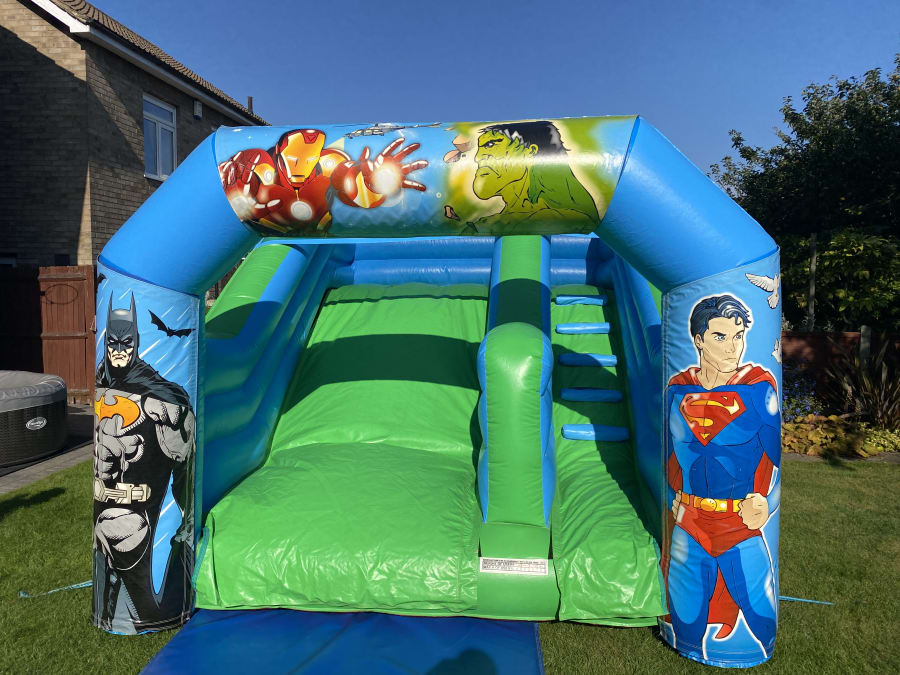 Superheroes Blue and Green Mini Slide ideal for our little guests. Our Superheroes Mini Slide is a perfect choice of hire as the theme suits Birthday Parties for both boys and girls. It available to hire both inside and outside.